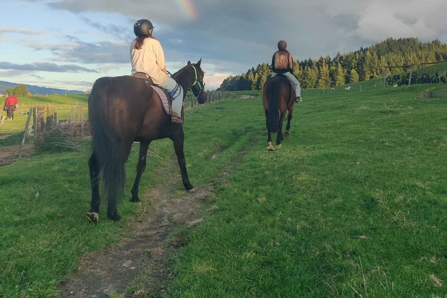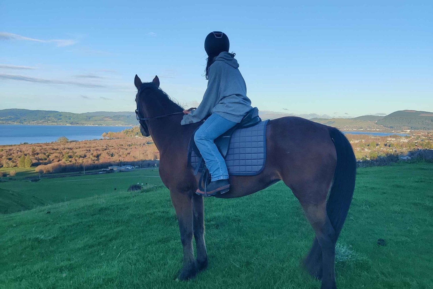 Entdecke die Schönheit von Rotorua bei einem 1-stündigen geführten Reitausflug Reite durch hügeliges Farmland und malerische Pfade und genieße die atemberaubende Aussicht über den Lake Rotorua und die umliegende Landschaft.