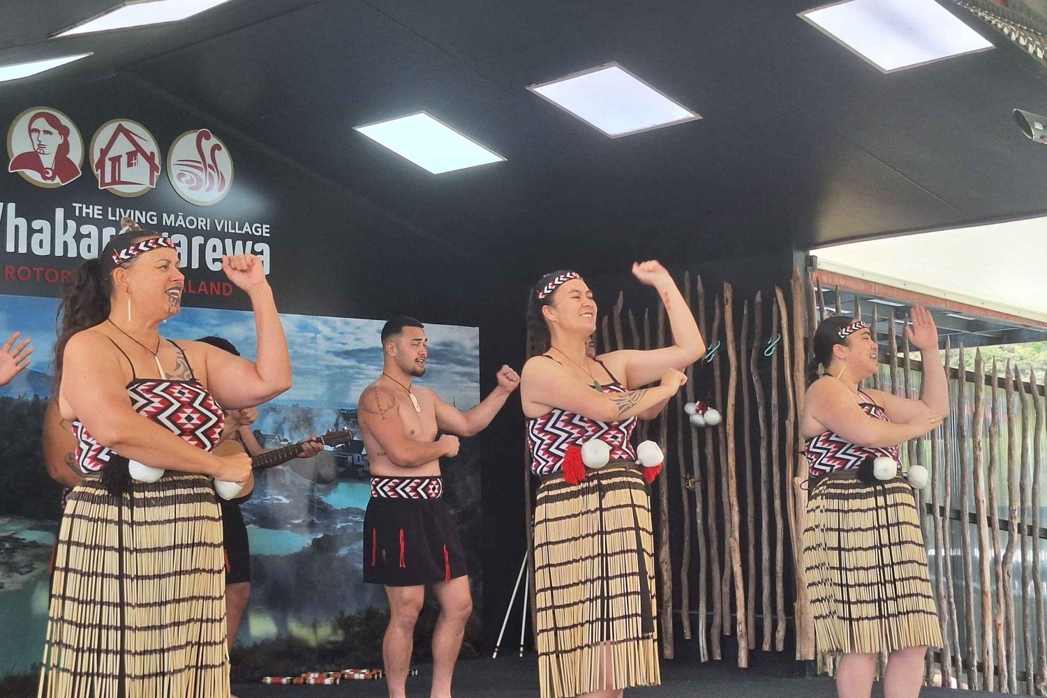 次に、有名なワカレレワ・リビング・マオリ・ビレッジへ向かいます。この重要な地元部族の実際の子孫から、先住民とその生活様式と歴史について体験し、学んでください。最高品質の文化ショーをお楽しみいただいた後、村の完全ガイドツアーをお楽しみください。活発な地熱泉や間近で噴出する間欠泉、料理の実演をご覧いただき、この地域と世界中の火山地帯との驚くべき関係について学びましょう。