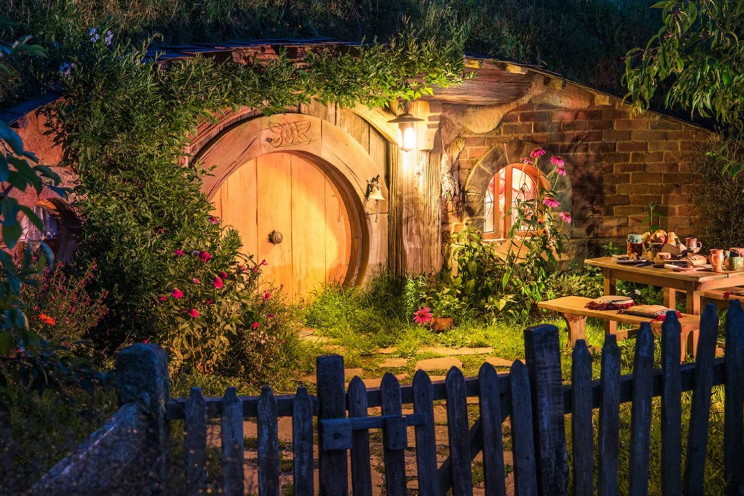 Deretter går du ombord på en av de grønne Hobbiton-bussene for å dra på en 2,5-timers guidet tur på dette fantastiske 12 hektar store filmsettet med en ekspertguide som sørger for at du får mest mulig ut av besøket. Under turen går du inn i de frodige beitemarkene i Shire, besøker 44 forskjellige hobbit-hull, ser fantastiske hager, hører de sjarmerende hemmelighetene og historiene om hvordan filmene ble laget, og avslutter Ringenes herre-opplevelsen med en kald drikk på den berømte Hobbiton Pub, Green Dragon Inn.