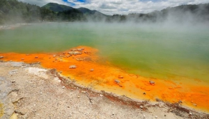 'Шампанское озеро' в термальном чуде Вай-О-Тапу является одним из самых популярных изображений Роторуа. Парк - популярное место 30 км от Роторуа, где также есть гейзер Леди Нокс, кипящие грязевые ванны и множество богато окрашенных бассейнов.